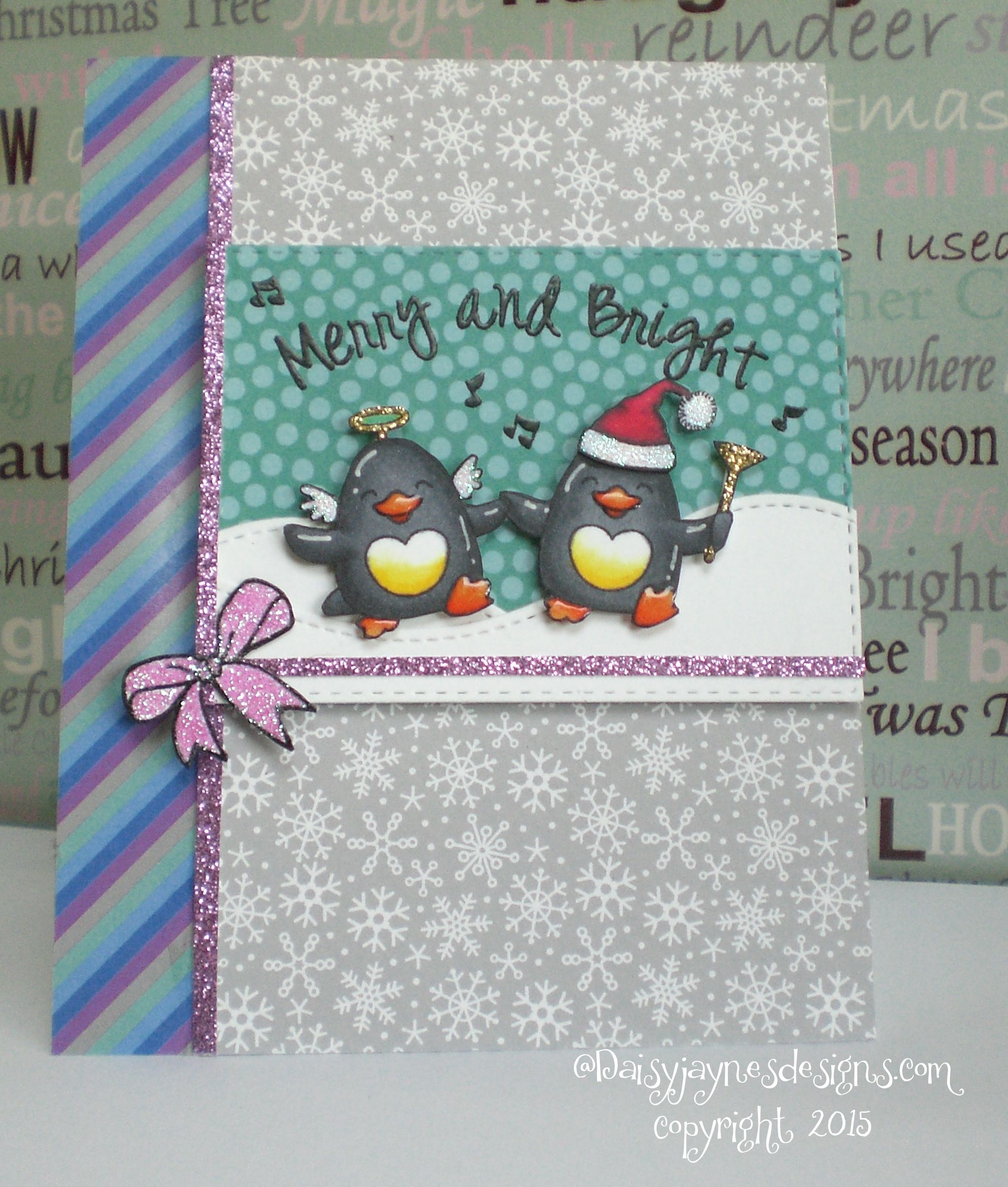 The images were stamped in Memento Tuxedo Black ink onto Neenah solar white card and coloured with Spectrum Noir Markers.The papers I used were from the Doodlebug Design ‘Frosty friends’ 6×6 paper pad and I added a bit of lilac glitter card to some sparkle 🙂 The sentiment and music notes were stamped in Versafine Onyx Black ink and heat embossed with a clear embossing powder. To finish the card off, I added some Stickles glitter and some glossy accents.